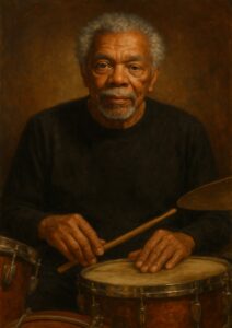 Cuando sonaba en contextos eléctricos, en música de sangre caliente, la sensación era física. No era “escucho una batería”. Era “el aire de la sala está cargado”. Como si los platillos fueran cables pelados soltando chispas en el borde del escenario. Una electricidad que no era rock ni era jazz de museo, sino una cosa callejera, húmeda, peligrosa y viva. Se notaba que la música estaba pasando ahora mismo, no en partituras antiguas. No era nostalgia. Era riesgo.