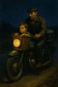 Había noches en que la isla nos devolvía a casa completamente desordenados por dentro. Después de alguna sesión de música y hierbas varias en casa del canadiense o en cualquier salón improvisado, mi padre me rescataba del sofá, me colocaba en mi cesto de pita y la Ossa verde rugía otra vez hacia la carretera. Axel subía detrás, más risueño que sobrio, con las baquetas asomando del bolsillo trasero como si fueran antenas captando otra emisora. El aire olía a campo, a gasolina y a algo que sólo mucho después aprendí a llamar libertad.