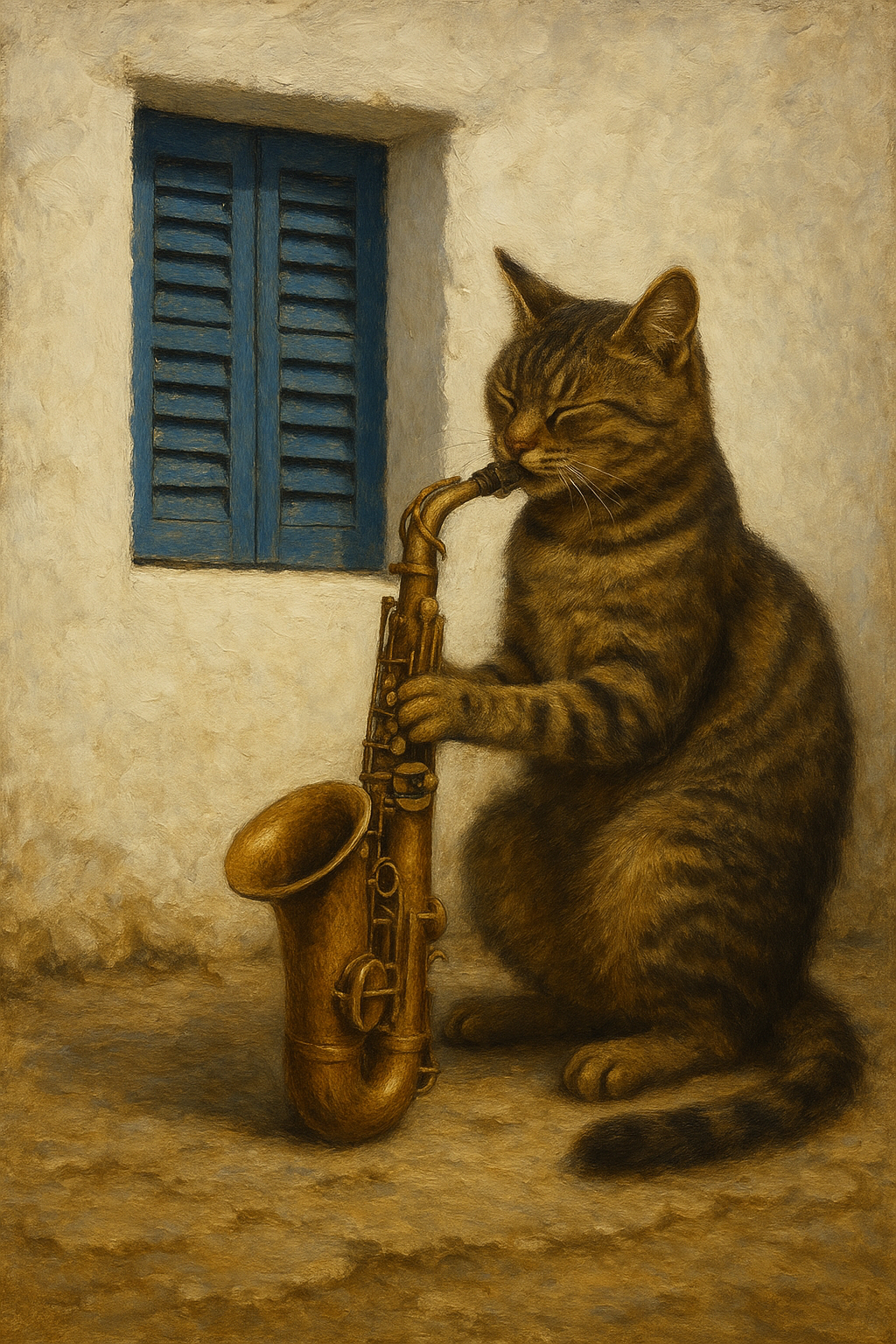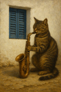 Uno de los epicentros de aquellas locuras era la casa de Graham Coughtry, el trombonista canadiense al que Axel llamaba con cariño, el chiflado. Graham no era sólo músico: era un pintor relevante de la escena canadiense. Su casa era sobre todo una extensión física del free jazz de la salamandra moteada. Estaba en la zona de Santa Eulària, colgada entre el campo y el mar, y tenía algo de escenario sin público fijo. En la cocina se mezclaban olores de sofrito ibicenco con humo de hierba, guisat d ́ous, café recalentado de esos que llamaban americano y el metal agrio de los instrumentos. En el salón los gatos se entretenían arañando algunos lienzos: figuras flotando, colores espesos, cuerpos medio borrados. A mí me parecía que aquellas pinturas sonaban; que si te quedabas callado un rato, podías oír el trombón dentro del óleo. A veces me quedaba como hipnotizado junto a la tribu de gatos que después llamaríamos los Jazz Stray Cats.